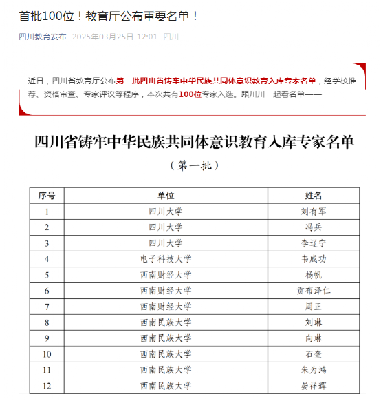 近日,四川省教育厅公布了第一批四川省铸牢中华民族共同体意识教育入库专家名单,我校白洁教授、贺新宇教授、花旭斌教授入选。 据悉,四川省教育厅此次组建民族教育专家库,旨在整合全省高端教育资源,为民族教育科学研究、政策制定、项目评审及赛事活动等提供智力支持。入库专家将重点围绕铸牢中华民族共同体意识教育开展决策咨询、学术指导等工作。 我校三位专家经严格推荐评审程序最终入选,充分体现了我校在民族教育领域的学术积淀与社会贡献,也代表着我校民族教育工作的科学化、专业化水平。    白洁,女,中共党员,博士、教授、硕士生导师,数字化学习技术集成与应用教育部工程中心特聘教授。兼任四川省红色文旅产业促进会副会长,四川省应用型人才培养指导委员会副主任委员,四川省专业设置与建设指导委员会委员,中国大学生体育协会定向分会副主席,教育部本科教学工作审核评估专家、合格评估专家,中国教育学会督导分会常务理事,省级课程思政示范团队负责人,省级新文科改革与实践项目负责人。 主要研究领域:青少年思想政治教育,应用伦理学,红色旅游。近年来,出版学术专著2部,主编教材1部,参编书6部。获得四川省教学成果一等奖,国家民委社会科学奖三等奖。主持参与国家级、省部级课题30余项。长期以来将科学研究与高等教育教学实践紧密结合,是四川省级课程思政示范教学团队负责人,主持参与省级教学改革重大、重点项目4项。在《光明日报》发表《激活红色资源,铸就红色育人品牌》。主笔完成《关于新疆大学生对涉民族国际舆论的认识和态度的调研报告》、《内地高校港澳学生思想政治状况报告》经上报中央办公厅,观点被采用,得到中央领导同志肯定性批示并被相关部门采纳。作为负责人完成的《关于四川省旅游促进各民族交往交流交融发展实践的调研报告》获得国家民委社会科学研究成果奖三等奖。在民族教育领域的主要研究成果有:主持四川省铸牢研究基地重点项目《民族节庆在铸牢中华民族共同体意识宣传教育中的典型经验研究》、国家民委重点项目《旅游促进各民族交往交流交融实践路径研究——以四川省为例》、四川省教育厅思政工作质量提升精品项目《民族地区高校“一线四点三维+N”铸牢中华民族共同体意识教育模式构建与实践》;著有《反思与超越:新时期中小学德育模式理论与实践研究》《四川省青少年思想道德建设研究报告(2015-2016)》;发表的论文主要有:《互联网思维与高校思想政治教育工作模式的融入性研究》《中小学校思想道德教育生态的形成与实践探索》等。  贺新宇,男,博士,二级教授。现为国家社科基金同行评议专家,全国普通高校本科教育教学评估专家,四川省普通本科高校教指委委员、省高教研究专委会理事,中共四川省委统战部“百名党外英才库”成员,贵州省、陕西省社科项目评审专家,西华师范大学教育硕士(MED)研究生导师、西南民族大学公共管理硕士(MPA)研究生导师,凉山州社科联顾问、“双定向”职称评审高评委主任,凉山州决策咨询委员会委员、文旅商服组组长,西昌学院发展规划处处长、民族教育研究所所长。2011年,由于在民族地区“农村教育烛光行动”等方面的突出贡献,被民盟中央授予“全国先进个人”称号。 主要研究领域:民族教育学科、心理学、学校管理学。主持完成与民族教育相关的国家社科基金项目、教育部人文社科一般项目、国家民委“双重大”现实问题研究项目、国家民委高教教改项目、四川省社科规划重点项目等教学、科研项目29项。在中国社会科学出版社等国内著名出版社出版学术专著。在民族教育学科领域研究成果丰硕,创新构建“中华民族多元一体和谐教育”理论体系,有效助力民族地区学校铸牢中华民族共同体意识;主持的《心理学》入选四川省精品课程、《学校管理学》入选四川省一流本科课程;主编的《新编教育学》入选四川省“十二五”普通本科规划教材;“民族地区教研训一体化教师专业发展模式”获四川省基础教育教学成果二等奖。  花旭斌,男,教授。四川省普通本科高等学校新工科教学指导委员会委员,西昌学院少数民族预科教育学院副院长。 主要研究领域:高等教育学、食品科学与工程。主持教育厅教研教改项目1项、校级2项,参研省级3项、轻工行指委1项,主编教材1部、副主编教材2本,参编教学专著2部。作为主要参与者的教学成果《民族地区地方本科院校应用型转型发展的探索与实践》《民族地区应用型本科工科类专业实验室“一三三三”建设与管理模式研究》分别获得省级教学成果奖二等奖、三等奖,主持四川省铸牢中华民族共同体意识研究基地西昌学院铸牢中华民族共同体意识研究中心项目《美育化人——铸牢中华民族共同体意识视域下民族地区高校预科美育教育路径的构建与实践》。参加建成省级教学工程特色专业1项、省级卓越工程师教育培养计划项目1项,立项建设教育部产学合作协同育人项目1项。主持省级科研课题2项,州级2项,市级1项;发表学术论文20余篇,其中A刊4篇;发明专利1项,实用新型专利4项;主编学术专著1部,副主编学术专著2部;获得凉山州科技进步奖二等奖4项,凉山州科学技术创新三等奖2项。助力我校顺利通过上一轮本科教学工作审核评估,协助修订教学质量